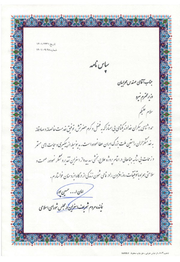 به گزارش پایگاه اطلاع رسانی شرکت آب منطقه ای خراسان شمالی،"امان ا... حسین پور" در این سپاسنامه خطاب به وزیر نیرو نوشته است: "بدینوسیله از پیگیری و حمایتهای مستمر و زحمات بی شائبه جنابعالی در اتمام پروژه علاج بخشی سد بیدواز اسفراین تقدیر و تشکر نموده، صحت، و سلامتی همراه با توفیقات روز افزون را در تمامی شئون زندگی از درگاه ایزد منان خواستارم".